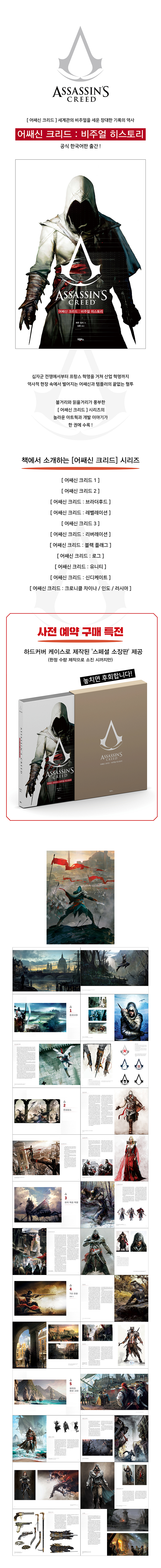 [어쌔신 크리드]는 중세 예루살렘의 십자군 전쟁과 해적들이 들끓는 카리브해 바다와 프랑스 혁명 등의 역사적인 현장에서 서로의 이념과 가치를 위해 어쌔신과 템플러가 대립하는 액션 어드벤쳐 게임이다. 유비소프트의 핵심 아티스트들과 폭넓은 인터뷰와 놀라운 컨셉 아트를 볼 수 있는 [어쌔신 크리드 : 비주얼 히스토리]에는 알테어에서 신디케이트의 제이콥에 이르기까지 게임시리즈에 등장하는 주요 캐릭터와 역사적인 환경에 대한 비주얼 컨셉 아트를 가장 포괄적인 컬렉션으로 소개하고 있다. 게임 저널리스트 매튜 밀러가 집필한 [어쌔신 크리드 : 비주얼 히스토리]는 시리즈에 대한 궁극적인 핵심 기반체로써 주요 게임 프랜차이즈의 예술적 감성을 원하는 이들에게 훌륭한 책이 될 것이다.