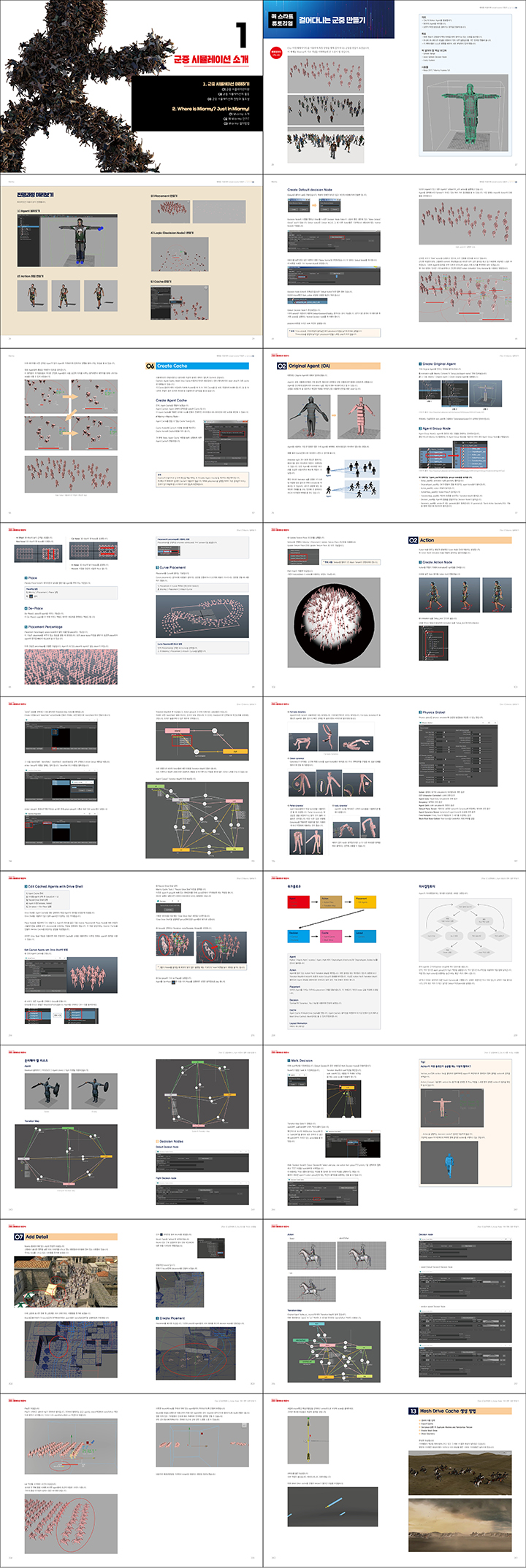 Miarmy(마이아미)를 이용하여 영화 속 군중 씬을 제작할 수 있는 시뮬레이션 테크닉을 소개한다. Miarmy는 [월드워Z], [안시성], [신과함께], [부산행] 등의 영화 속에 등장하는 군중들을 자유롭게 제작하고 제어할 수 있는 마야 플러그인이다. Miarmy의 걸어다니는 군중들을 제작하는 간단한 튜토리얼을 시작으로 전반적인 프로세스를 익히고, Miarmy의 다양한 기능과 특징에 대해서 알아본다. 그리고 Auto Fight 모드를 이용한 대규모 전투를 만들어보는 ‘Fighter’와 RBD Emitter, Dynamic system으로 기마병을 공격하는 ‘Horse Rider’, 그리고 여러 Action을 이용하여 다양한 상황을 만들어 보는 ‘City’ 예제를 다루어 볼 수 있다.